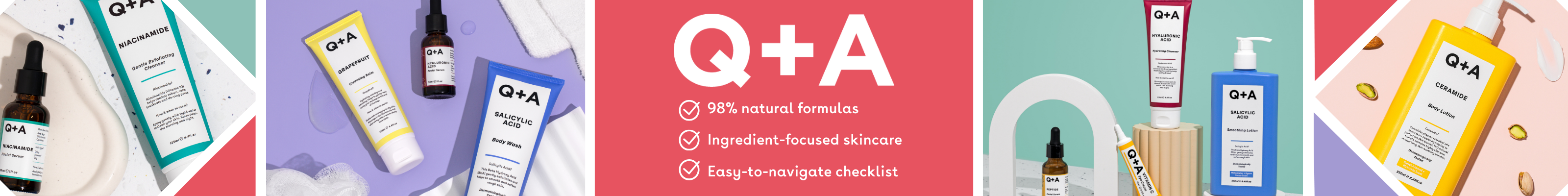 Q+A er et naturlig og ingrediensfokusert hudpleiemerke fra Storbrittania. Hudpleie kan for mange føles forvirrende, men Q+A gjør det enkelt å finne riktige produkter for ansikt og kropp. Dette ved hjelp av deres unike Q+A-sjekkliste som er trykt på alle produktene. Alle produktene er formulert med naturlige nøkkelingredienser som bidrar til å fremme en sunn hud.